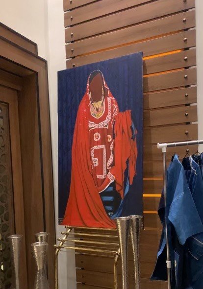 In some ways, they serve as cultural archives. Another exhibiting artist, Ibrahim Saliu, spoke about the inspiration behind his own painting. His work also documents lived culture. The story began in 2019, when he travelled to Maiduguri and met a woman whose image became his artwork. “I had to look for someone to translate because I couldn’t speak Kanuri,” he said. “She agreed after initially saying no, then I took the picture and I came up with this.”