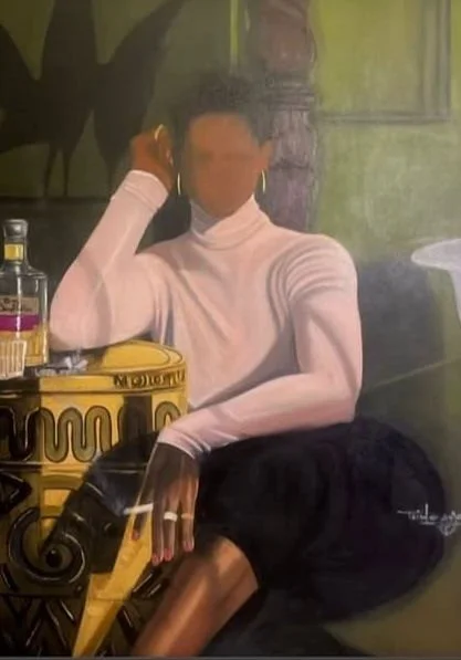 The second is part of a series I'm working on. This figure clearly doesn't have a face. Yet, she holds a cigarette and she has alcohol seated in front of her, which makes the non-artistic man wonder how she's taking them in.